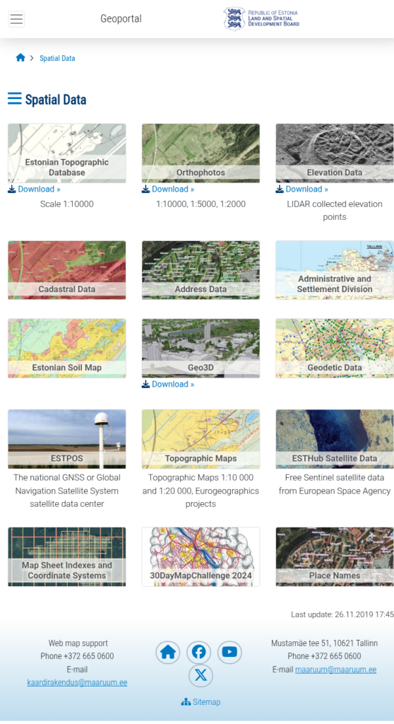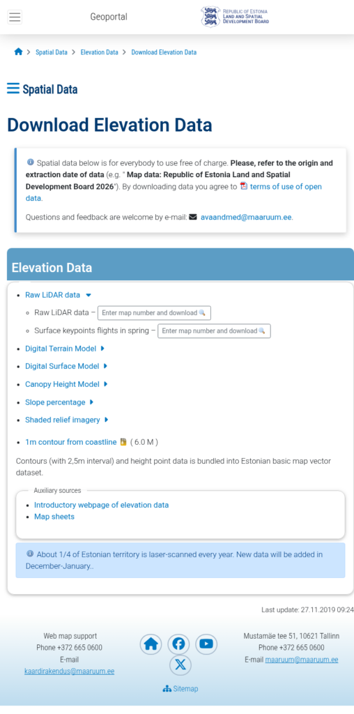 Maa-amet Geoportaal is Estonia’s official geospatial data portal operated by the Estonian Land Board. It provides free access to high-quality LiDAR data, digital terrain models, digital surface models, and canopy height models covering all of Estonia.