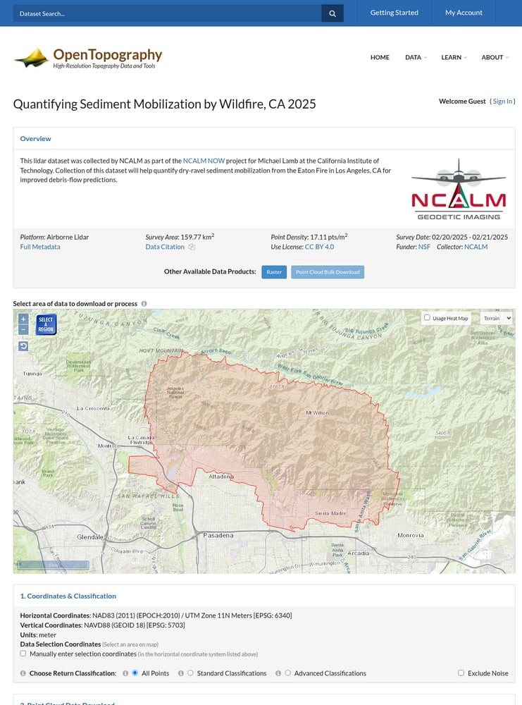 Each dataset has a specific citation available on its metadata page. Generally, cite both OpenTopography as the platform and the original data collectors/funders. For example: “Data provided by OpenTopography (https://opentopography.org). [Dataset Name], collected by [Collector], funded by [Funder], DOI: [DOI].”