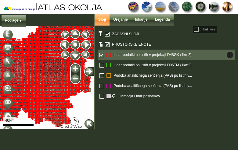 ARSO GIS portal homepage with LiDAR download option
