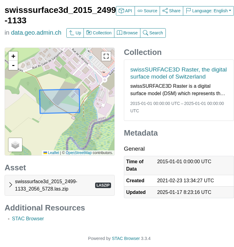 STAC browser showing the swissSURFACE3D collection with tile listings