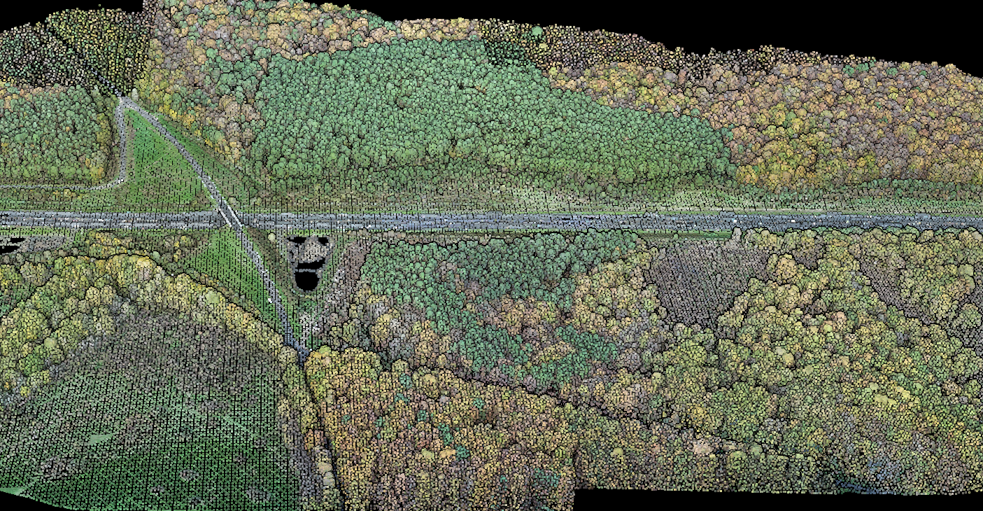 RGB-colorized point cloud showing a forest area with road corridor.