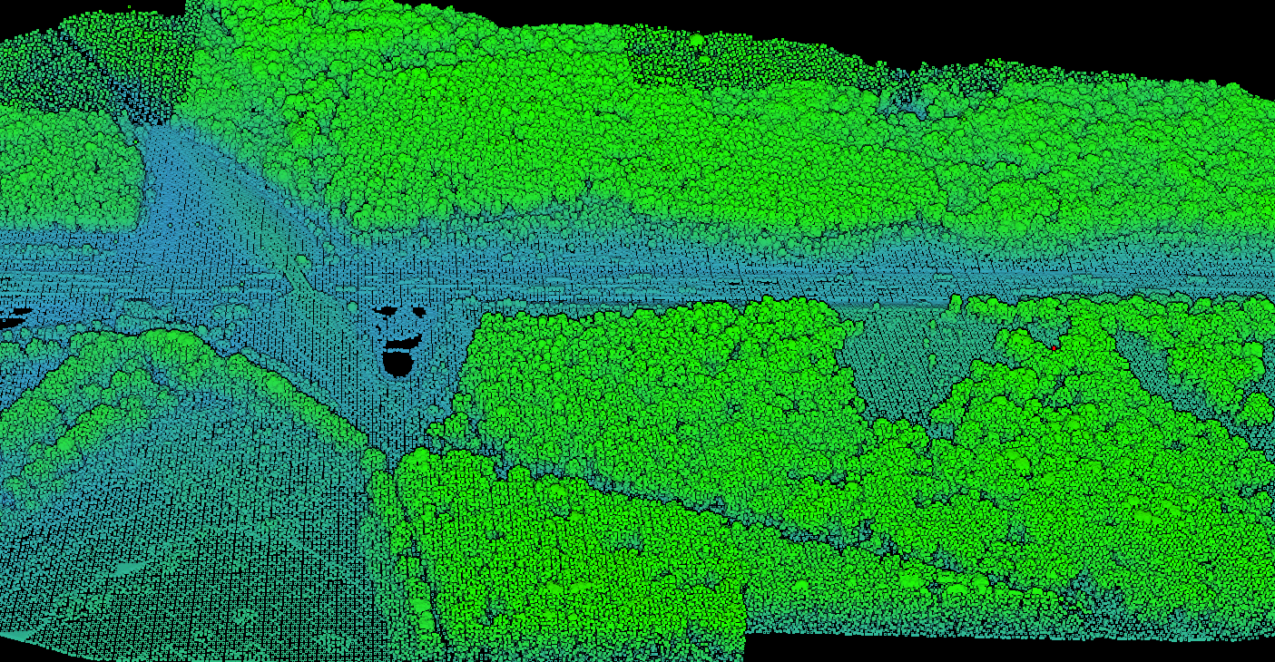 Point cloud classification of a forest corridor showing ground and vegetation separation.